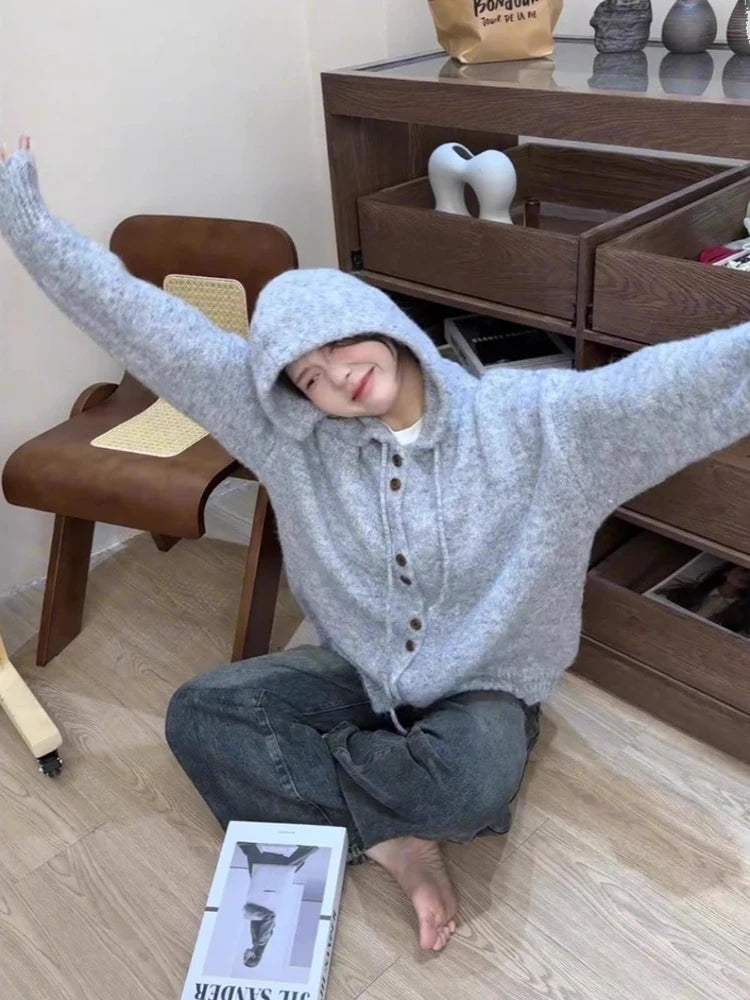 Cozy Drawstring Hooded Knit Cardigan Sweater