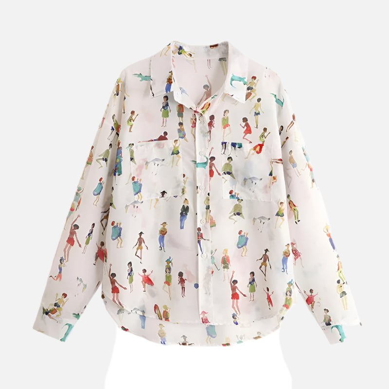 French Figure Print Loose Chiffon Shirt