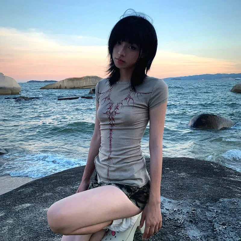 Vintage Tattoo Print Knitted Irregular T-Shirt